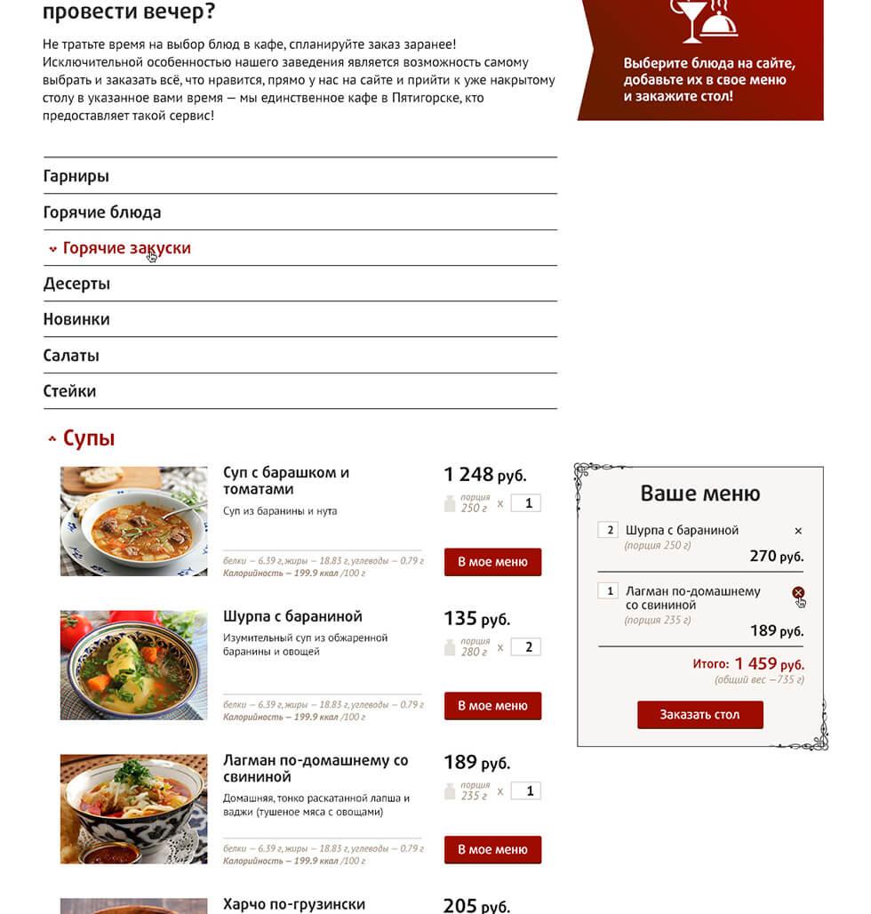 Помимо редкой фишки с актуальным онлайн меню стала изюминка в виде адаптивного дизайна. Аналогов данному ресторану по уровню проработанности дизайна и удобству пользования в регионе на момент создания и запуска просто не существует — это первый в Пятигорске и на КМВ сайт ресторана с адаптивным дизайном! Мы гордимся этим проектом!