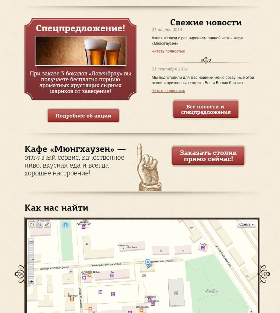 Основной «изюминкой» сайта конечно же стало меню, полный и актуальный аналог которого представлен на сайте. Любой, будь то новый или завсегдатый, кафе сможет самостоятельно спланировать стоимость и количество калорий своего отдыха.