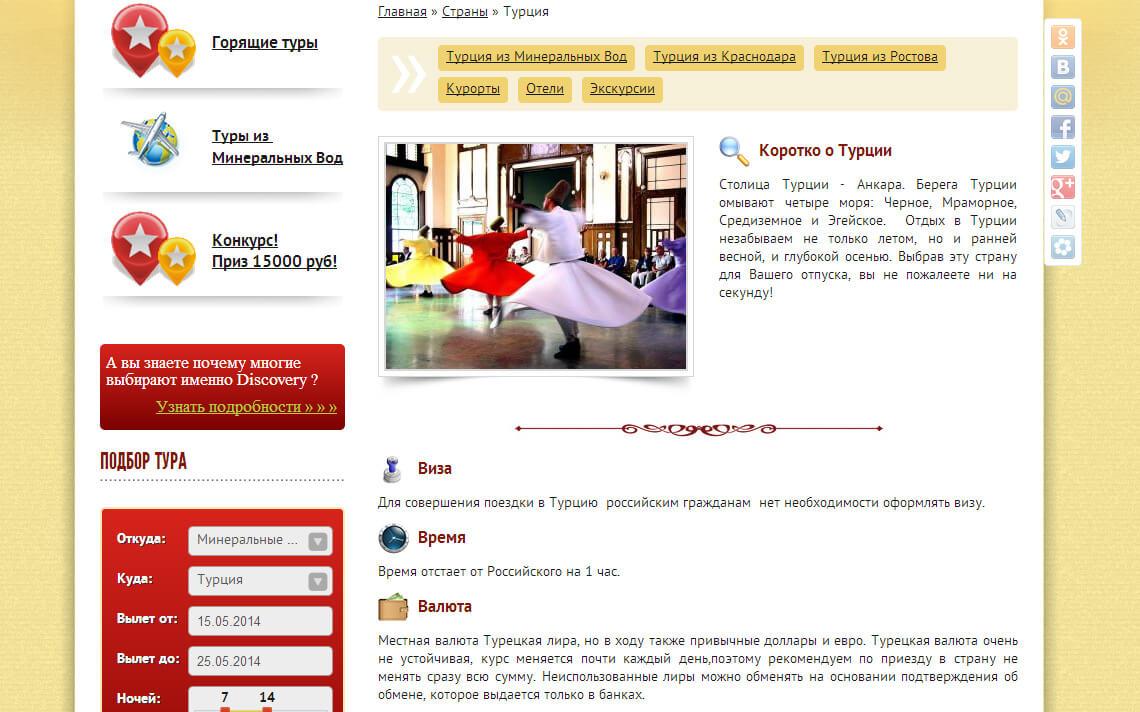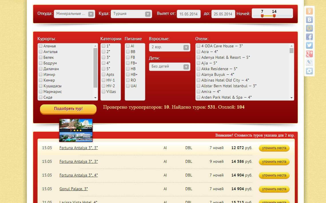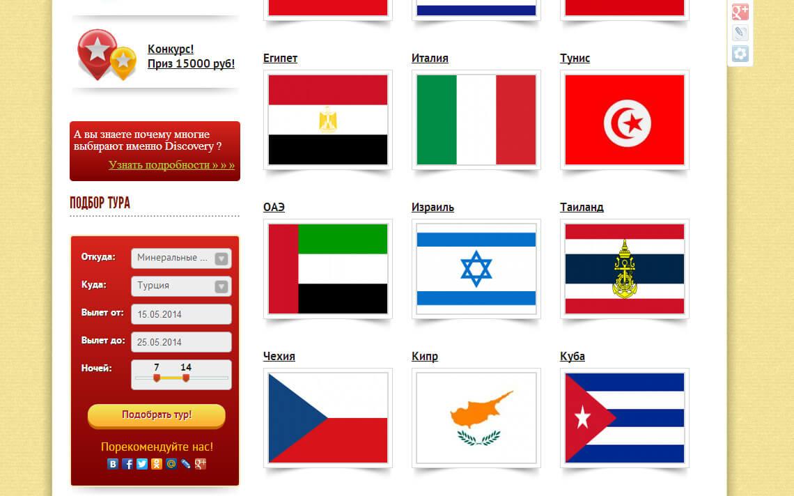Особенно стоит отметить систему поиска туров. В отличие от других турагентств, она выполнена в едином с сайтом стиле и использует информацию от более чем 100 различных туроператоров, предоставляю посетителям самую актуальную информацию о турах