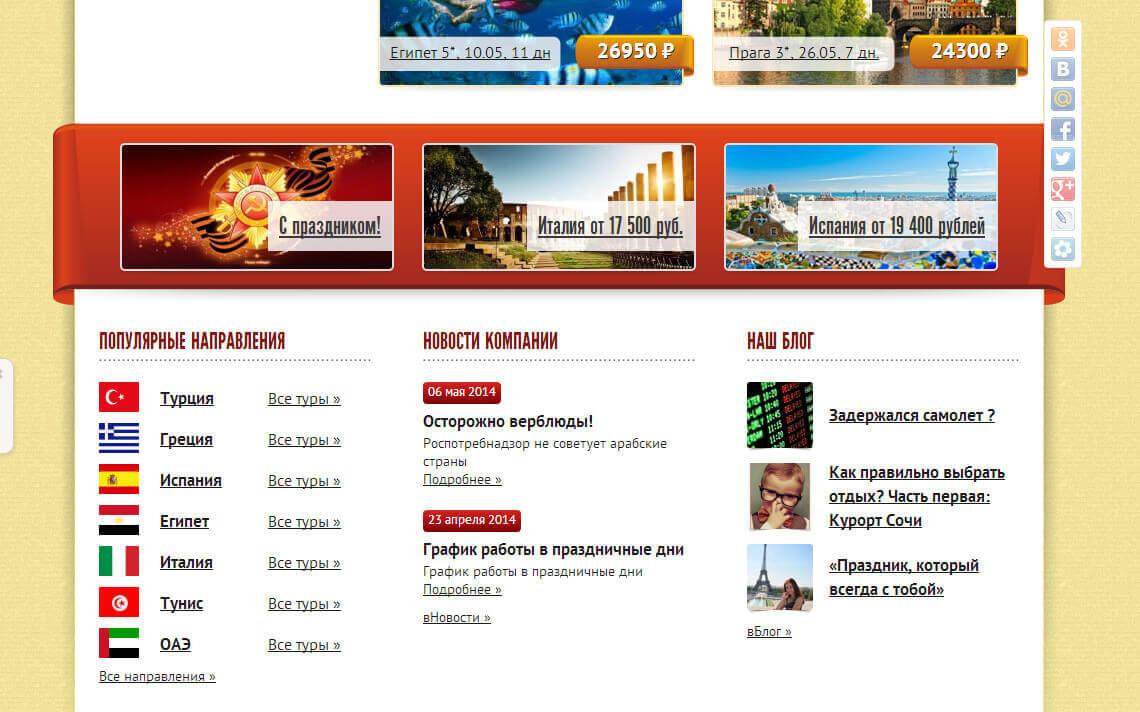 Сделать удобный и современный сайт туристического агентства, который не имеет аналогов в регионе. Предоставить туристам возможность видеть актуальные цены на все направления при том что поддержкой огромного числа страниц мог бы заниматься всего один менеджер. Подключить систему поиска туров и оформить её в стиле сайта.