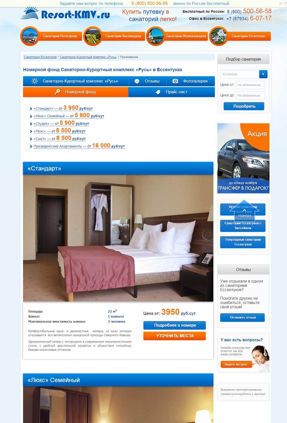 Функциональность данного сайта практически не имеет аналогов в своём ценовом диапазоне, потому что предоставляет возможности детальнейшего описания всех санаториев. В добавок заложена лёгкость масштабирования системы для продажи мест во всех отелях региона КавМинВод.